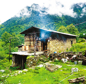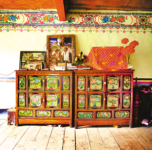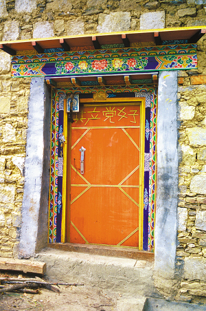 房屋大都是3層,上層存放干草和秸桿,下層關(guān)養(yǎng)牲畜,中間一層是居室。居室用木板隔間,里間較小是已婚子女住的,外間寬敞,是多功能堂屋。臨窗處設(shè)火塘,以利排煙,是家庭生活中心和待客之處?;鹛辽霞苤T大的鐵三角架,上面是六七厘米寬的鐵板圈,擦得錚亮,能烤制食物。墻角處供奉佛像,擺放領(lǐng)袖像。房門(mén)安設(shè)木鎖,用十幾厘米的木鑰匙開(kāi)啟,都是由硬木刻制,光滑耐用。