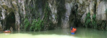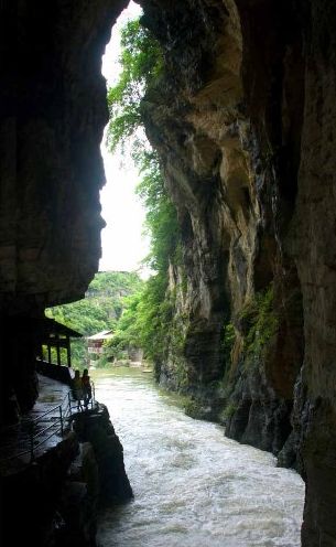 水洞長1000余米,半是人工半天然,登舟入洞,借助稀疏的燈光和導游的手電筒辨認著一處一處各各不同的景物,頗有一點神秘之感。洞盡船出,豁然開朗,但見茂竹修篁叢叢簇簇,一泓綠水微波不興,野趣天成,靜謐無聲,此處名“竹林翠溪”,宛如一世外桃源。旱洞共三層,滿布著形態(tài)各異的石鐘乳、石筍、石柱、石幔,其第三層洞廳軒敞,一座天然石橋飛架兩懸崖間,人稱“奈何橋”,橋下即是深不可測的陰潭,景觀之奇特,令人叫絕。旱洞出口處,有苗寨一座,是專為旅游者興建的,游人盡可在此親身體驗一次苗家的婚俗。